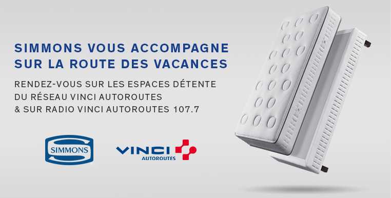 Présent sur 10 aires* d’autoroute Vinci cet été, Simmons prône le « bien dormir pour mieux conduire » et vous invite à vous reposer et vous régénérer.